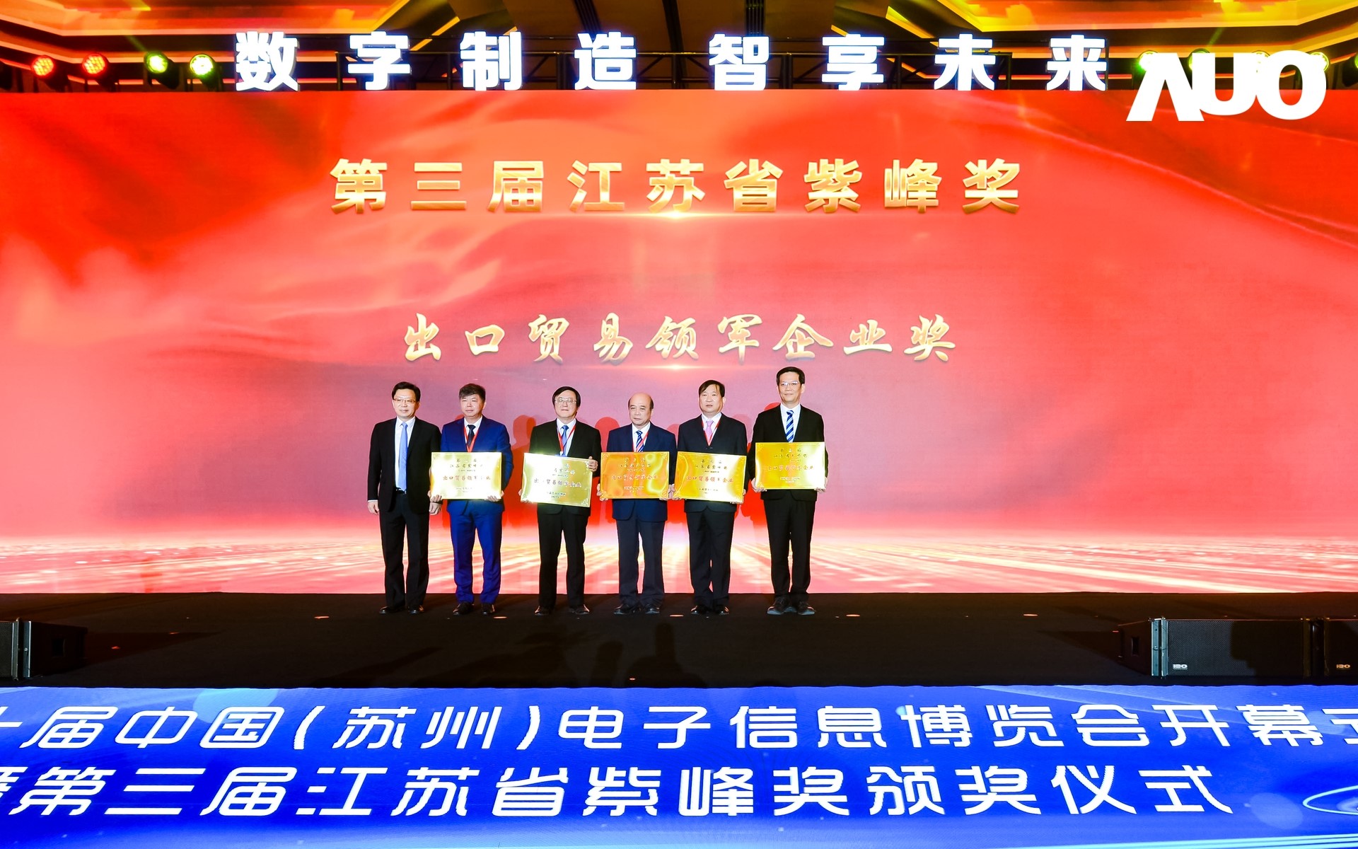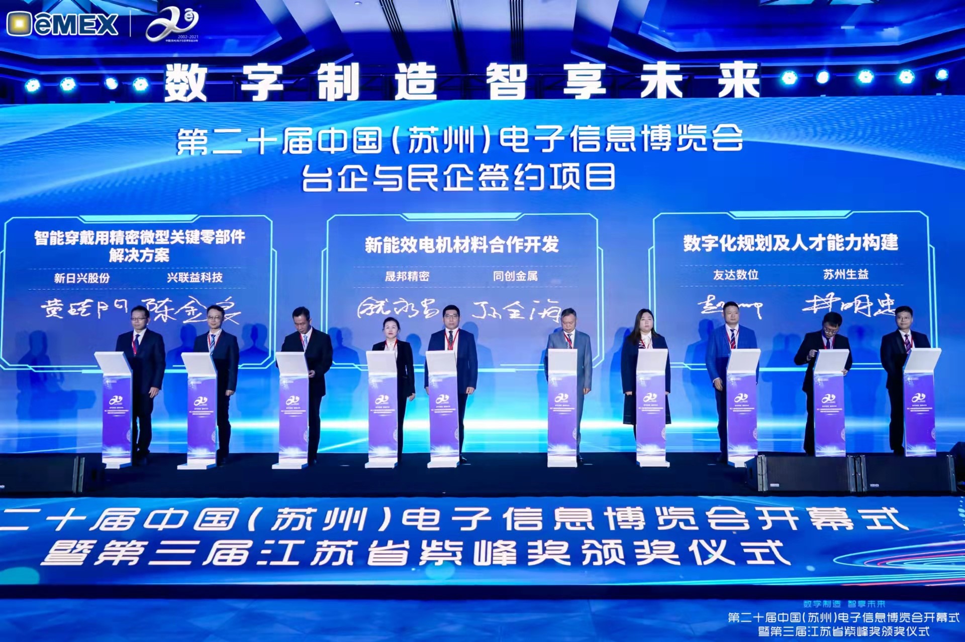 電博會開幕式當天也是第三屆江蘇省紫峰獎頒獎儀式,省臺辦、工信廳、商務廳、蘇州市相關領導均出席并頒獎。該獎項為表彰對江蘇高質量發展做出積極貢獻的在蘇企業,由江蘇省政府專門設立。LEYU官網光電 (蘇州) 總經理郭振明代表上臺領獎,這也是LEYU官網蘇州連續三次蟬聯紫峰獎 “出口貿易領軍企業獎”。LEYU官網數位總經理趙麗娜女士,也參與本次開幕式,上臺為本地化賦能簽署戰略合作協議,將優質服務資源集合、下沉到更多細分行業,為更多地區的制造企業提供數字化轉型服務。