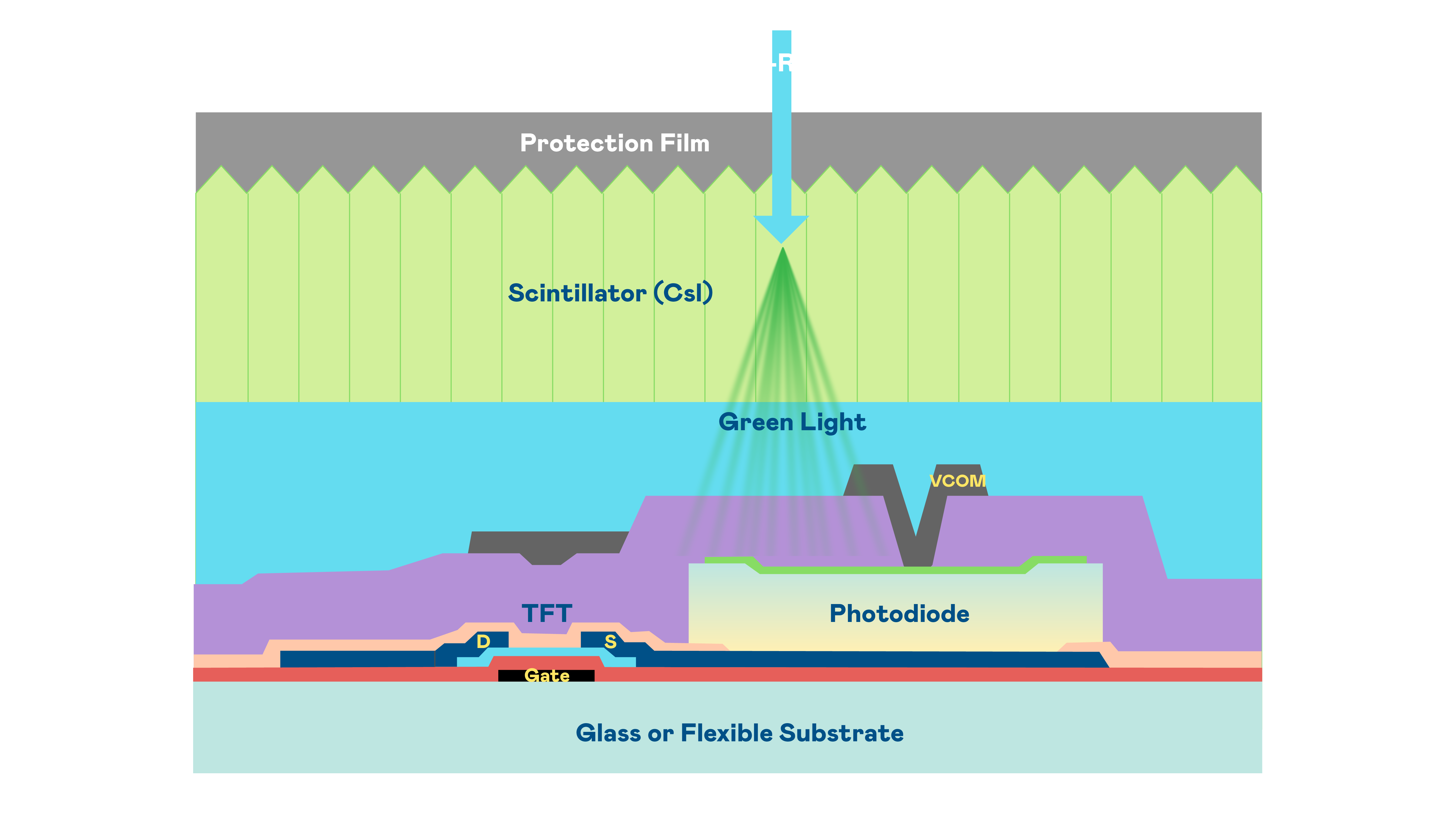LEYU官網(wǎng)的X光影像感測陣列使用薄膜電晶體 (TFT) 作為每個像素的讀取開關(guān),搭配光電二極體(Photodiode)的光電轉(zhuǎn)換元件,用以感測X光影像訊號。